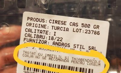Cireșe din Turcia tratate cu Imazalil și Thiabendazon, substanțe considerate toxice, însoțite de recomandarea de a nu le fi consumată coaja, sunt puse în vânzare...